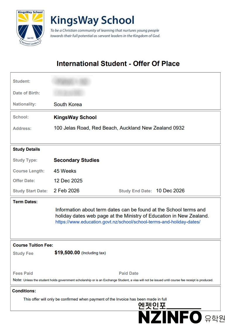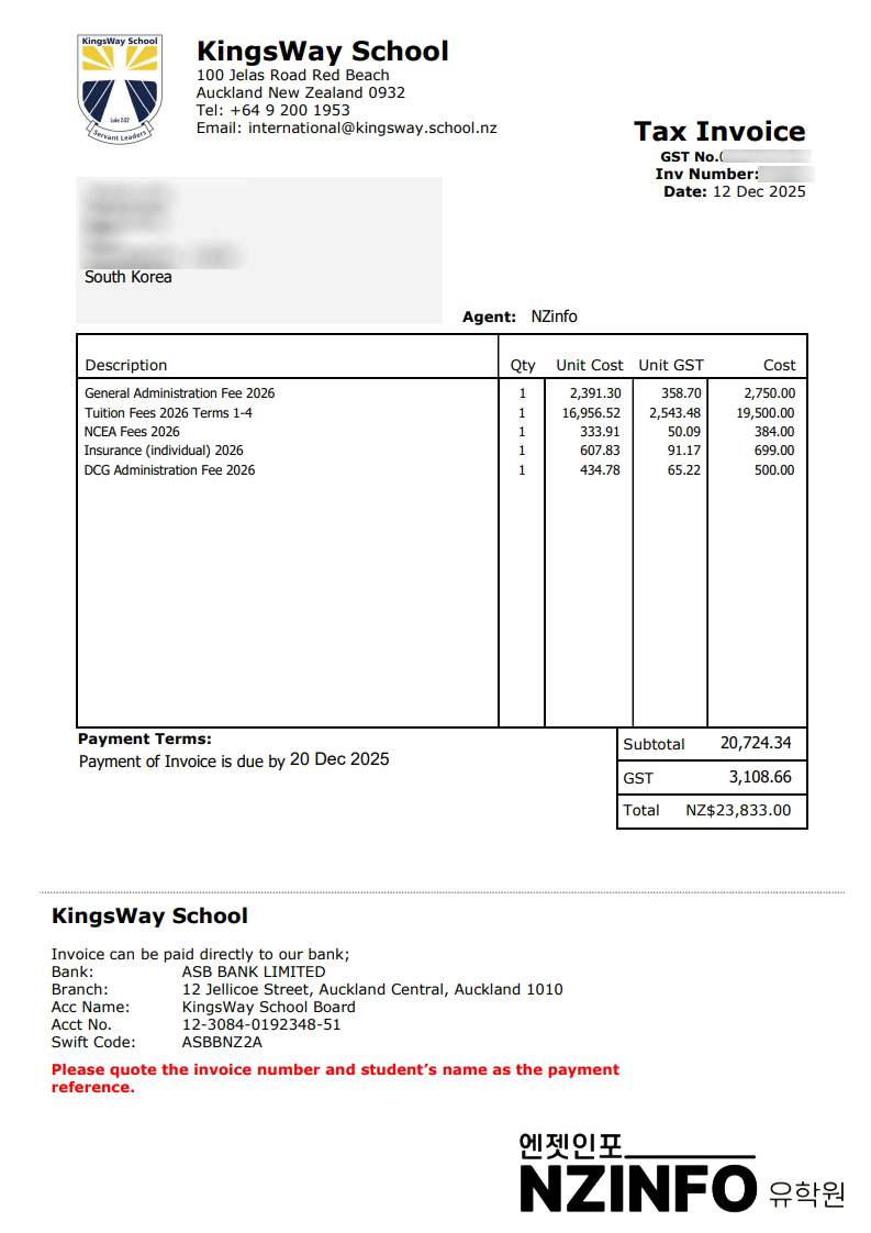 뉴질랜드 킹스웨이 스쿨 (KingsWay School) 2026 학비 안내