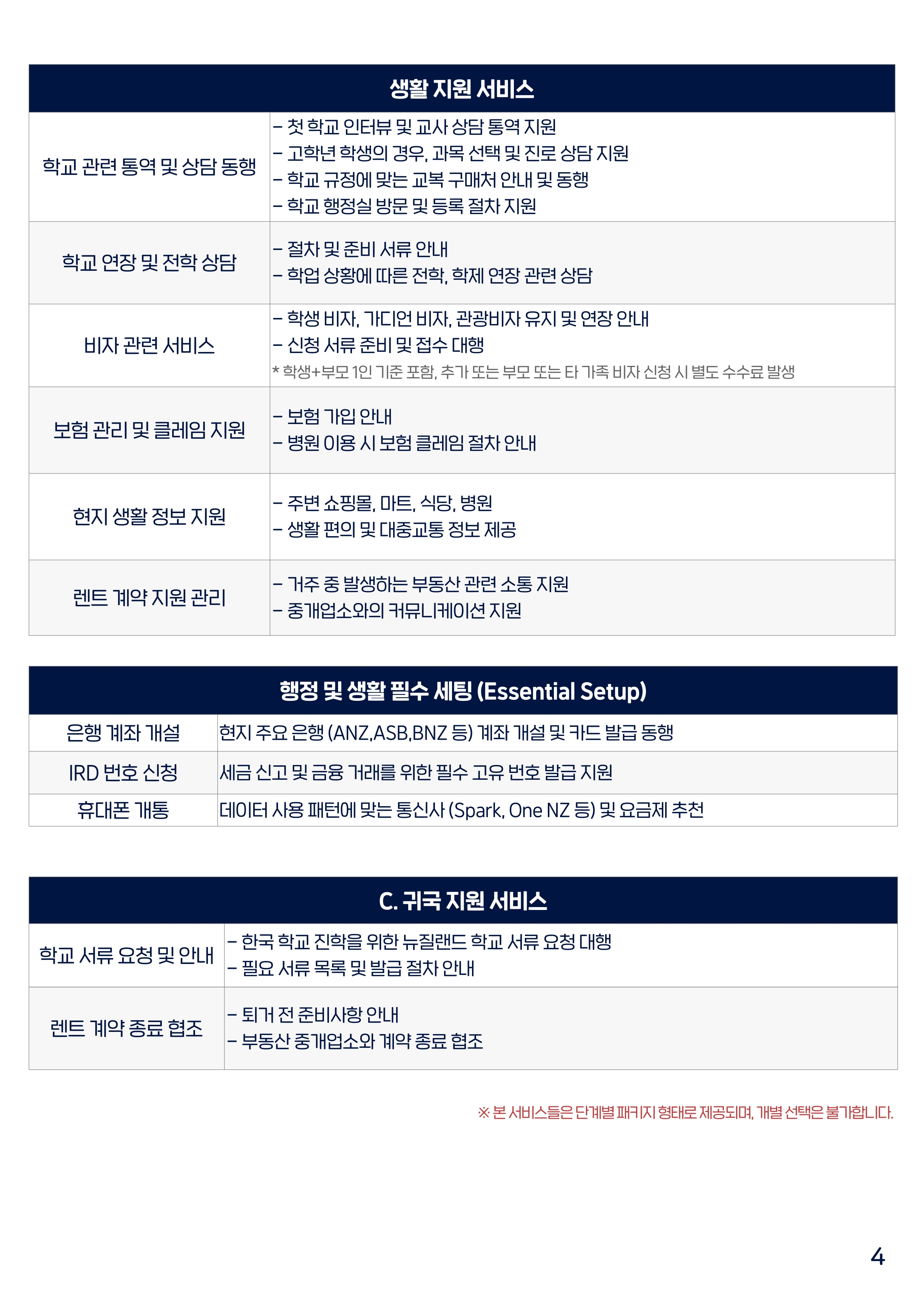 뉴질랜드 초기 정착 서비스 가격