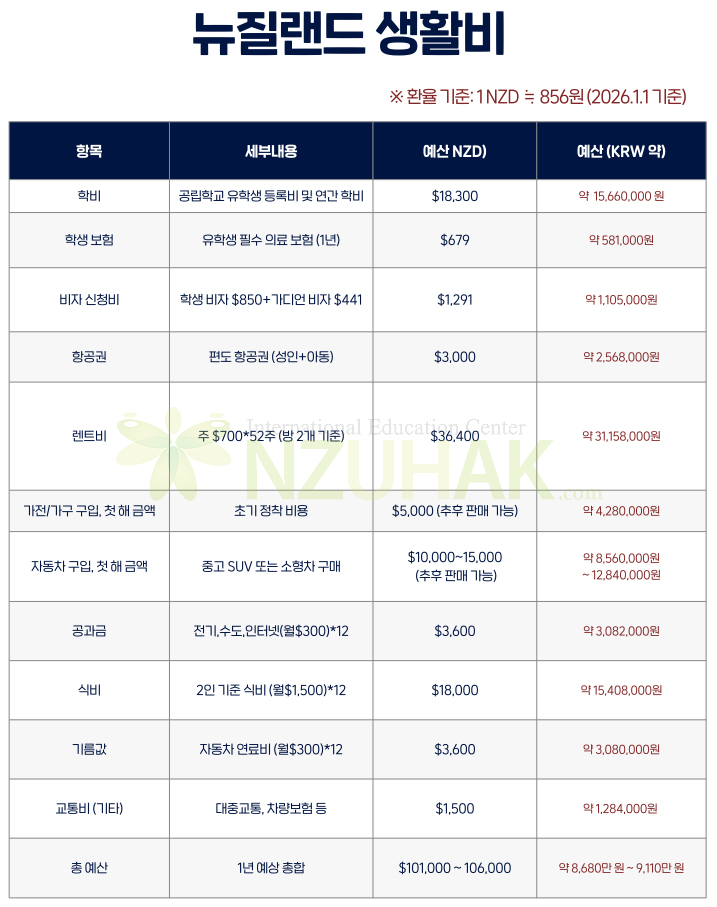 뉴질랜드 조기유학 총비용 요약 (1년 기준)