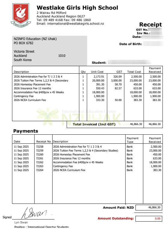 뉴질랜드 오클랜드 명문 공립 여학교 웨스트레이크 걸스 하이스쿨 2026년 국제학생 학비를 항목별로 정리했습니다. 수업료, 행정비, 보험료까지 한눈에 확인하세요.