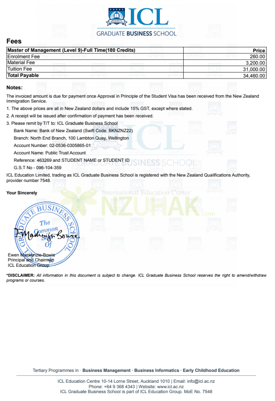 2026년 뉴질랜드 ICL 석사 총 학비: NZD $34,460