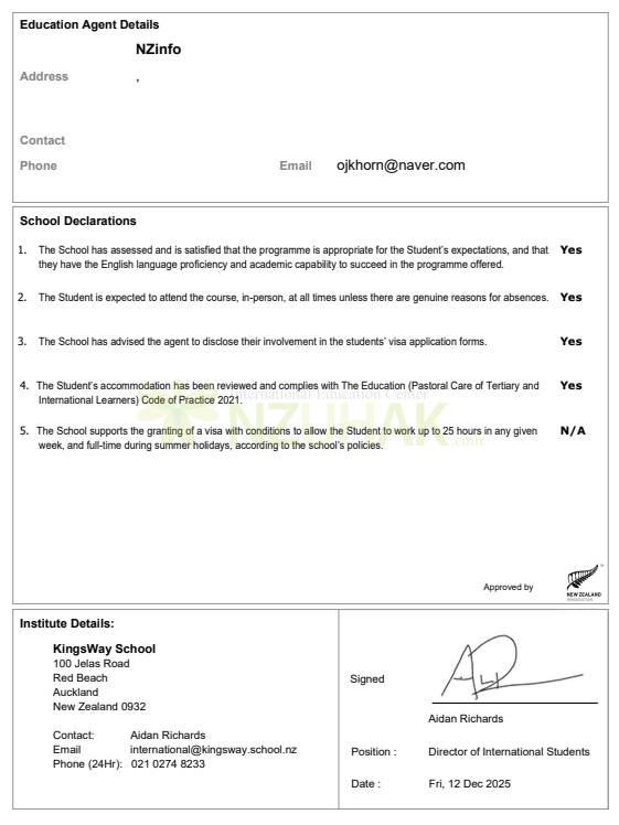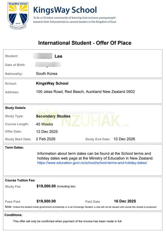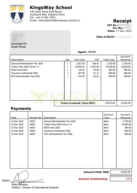 2026년 킹스웨이 스쿨 연간 총비용: NZD 23,833