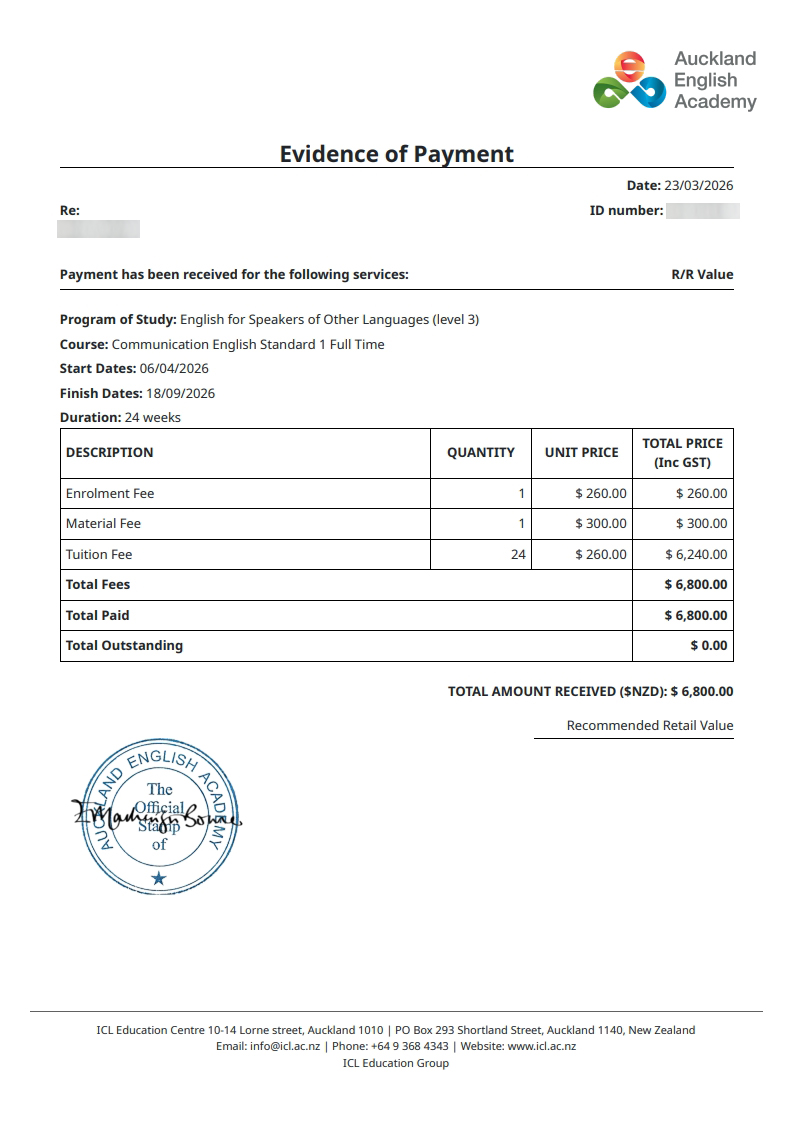 ✔ 학비 (Tuition Fee): NZD $6,240 (24주 기준)
