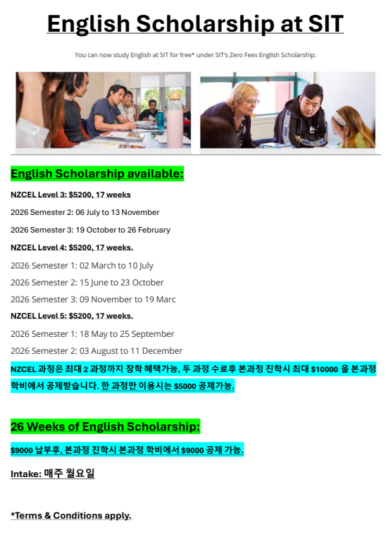 뉴질랜드 SIT 대학에서 영어 과정 장학금 최대 $10,000 혜택 제공. NZCEL 과정 후 본과 진학 시 학비 공제까지 가능한 현실적인 유학 루트 안내.